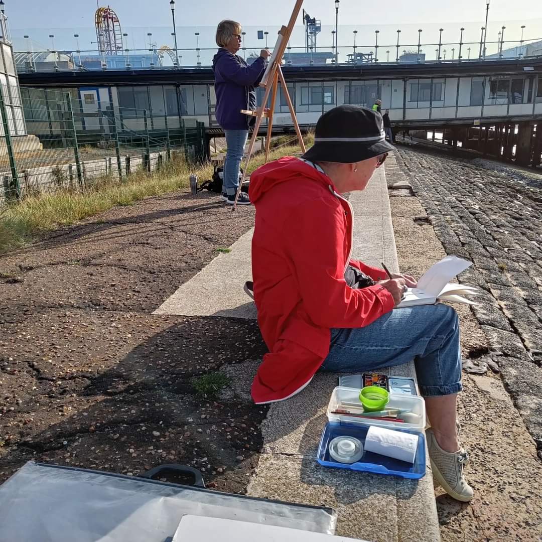 Andy Downes and a fine group of volunteers organised a plein air painting day around Southend Pier on Saturday the 30th September. The weather was perfect, not too hot, a slight breeze and best of all, dry! I would guess about 30 artists took part, including my sketching buddies Paul and Sue. Paul is an old hand at painting outside in all weathers but it was a first for Sue.